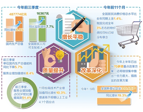 北方的冬天,寒风刺骨。不过,河北省崇礼县西湾子镇黄土嘴村村民老谢的心里却暖洋洋的。 “我现在一年的收入得有10万元了。”老谢说,过去村民们靠种土豆、蚕豆为生,一年到头人均收入不足1500元。随着2022年冬奥会的成功申办,崇礼的旅游业快速发展。村民们搞起了农家乐,还能到附近的滑雪场打工,光打工一项单季就能赚1.5万元。 百姓收入稳步增长,是2015年中国经济发展的一大亮点,也正是中国经济发展最大的底气。 事非经过不知难。一年来,面对复杂的国内外经济环境,党中央坚持稳中求进的工作总基调,创新宏观调控方式,以全面深化改革促发展、调结构、惠民生,取得了来之不易的成绩。 增速换挡—— 有“面子”更有“里子” 今年前三季度,我国国内生产总值487774亿元,按可比价格计算,同比增长6.9%。我国守住了全年经济增速7%左右的目标,在实现居民收入稳步增长的同时,物价等主要经济指标也运行在合理区间。 今年前三季度,我国新增就业超额完成全年计划目标。从物价水平看,今年前11个月,全国居民消费价格总水平比去年同期上涨1.4%,完成全年3%左右的物价调控目标已经没有悬念。 与此同时,根据城乡一体化住户调查,前三季度全国居民人均可支配收入16367元,同比名义增长9.2%,扣除价格因素实际增长7.7%,比上半年提高0.1个百分点;从2011年到2015年,我国中央财政专项扶贫资金从272亿元增长到467.45亿元,几乎翻了一番,预计这一专项扶贫资金规模还将进一步增长。 从全球经济体发展态势看,所有经济总量2万亿美元以上经济体增长超过2.5%已是不俗表现。我国6.9%的增长水平不仅远高于美国、日本和欧元区,也明显快于新兴市场国家和发展中经济体。 这说明,尽管从纵向看,中国经济增速在换挡,但并没有带来百姓收入的巨大波动,更没有影响到扶贫的步伐,可谓是既有“面子”也有“里子”。 事实上,经济增速的换挡,是由经济发展的客观规律所决定的。改革开放30多年来年均近10%的持续高增长,使中国成为了世界第二大经济体。今年前三季度,我国GDP增速虽然低于前几年的增长水平,但其相对应的不变价增量规模,已经远远大于上个世纪90年代的水平,也大于前几年7%以上的增长规模。我们完全可以自信地说,这一成绩来之不易。 而从另一个角度看,宏观经济增速放缓,也是我国经济发展步入新常态以后主动调控的结果。 当前,世界经济和贸易低迷、国际市场动荡对中国影响加深,与国内深层次矛盾凸显形成叠加,实体经济困难加大,宏观调控面临的两难问题增多。 任凭风吹浪打,我自岿然不动。处变不惊,保持定力,采取相机调控、精准调控措施,是我国宏观调控的一大亮点。 今年以来,按照“宏观政策要稳、微观政策要活、社会政策要托底”的总体思路,以及总量调节和定向施策并举、短期和中长期结合、国内和国际统筹、改革和发展协调的要求,我国不断完善宏观调控,适时预调微调,更加注重扩大就业、稳定物价、调整结构、提高效益、防控风险、保护环境,有力地保证了就业、物价、收入等指标继续运行在合理区间,经济发展质量和效益稳步提升,使广大人民群众共享改革发展成果,获得实实在在的好处。 发展方式—— 有“速度”更有“质量” 对经济增长速度的主动调整,本质上是发展理念和发展方式的转变。 世界经济复苏艰难曲折,中国难免受到影响。面对下行压力,我们完全可以出台大规模刺激措施,短期内实现更高速度的增长,但我们并没有这样做,因为高消耗、高投入的模式对中国而言难以持续,也会给世界经济带来风险。 “中国经济将保持平稳较快发展。”9月22日,习近平主席在美国西雅图发表演讲,以响亮的声音向全世界宣告了中国的信心和决心:中国将更重视提高经济发展质量和效益,加快转变经济发展方式、调整经济结构,更加注重创新驱动,更加注重消费拉动,更加注重解决经济发展中存在的不平衡、不协调、不可持续问题,使中国经济凤凰涅盘、浴火重生,保持强劲发展动力。 这就是说,面对大风大浪,中国经济这艘巨轮,既要行得远,更要行得稳,换挡不失速,量增质更优。 2015年第一天,被称为“史上最严”的新环保法开始正式实施,将企业的污染成本提升到了前所未有的高度。3月24日,中共中央政治局会议审议通过了《关于加快推进生态文明建设的意见》;11月17日,国办印发《编制自然资源资产负债表试点方案》,努力摸清自然资源资产的家底及其变动情况……一年来,我国大力推进生态文明建设,推动绿色循环低碳发展,“像保护眼睛一样保护生态环境,像对待生命一样对待生态环境”。今年前三季度,我国单位国内生产总值能耗同比下降5.7%。 “中国在‘国家自主贡献’中提出将于2030年左右使二氧化碳排放达到峰值并争取尽早实现……虽然需要付出艰苦的努力,但我们有信心和决心实现我们的承诺。”习近平主席在气候变化巴黎大会上的讲话,掷地有声。 新的发展理念,正在引领各地积极行动—— 政绩考核的“指挥棒”正在发生鲜明变化。8月9日,《党政领导干部生态环境损害责任追究办法(试行)》正式施行,从制度上将履行生态环境建设职责与干部选拔任用挂钩。这意味着,我们不再简单以GDP论英雄,而是要走出一条质量更高、效益更好、结构更优、优势充分释放的发展新路。 今年以来,各地区和企业纷纷结合自身实际,大